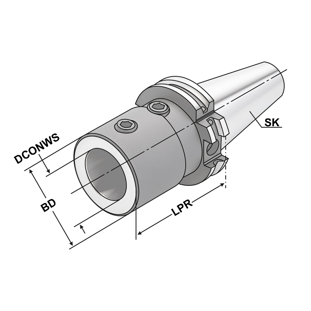 För montering av borr med cylindriskt skaft enligt DIN 6595, kronborr eller korthålsborr.