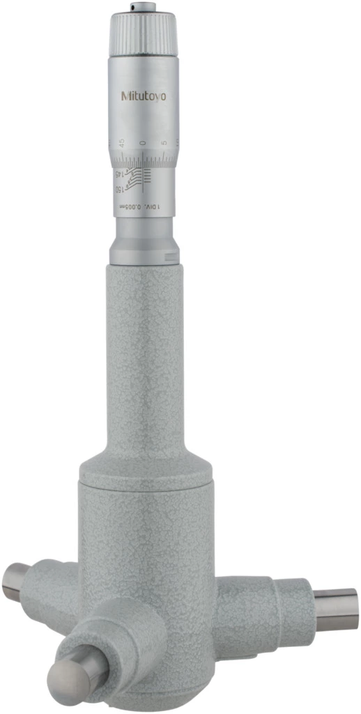 Analog trepunktsmikrometer. Mätytor och kona i härdat verktygsstål. Friktionsspärr garanterar repeterande mätningar.