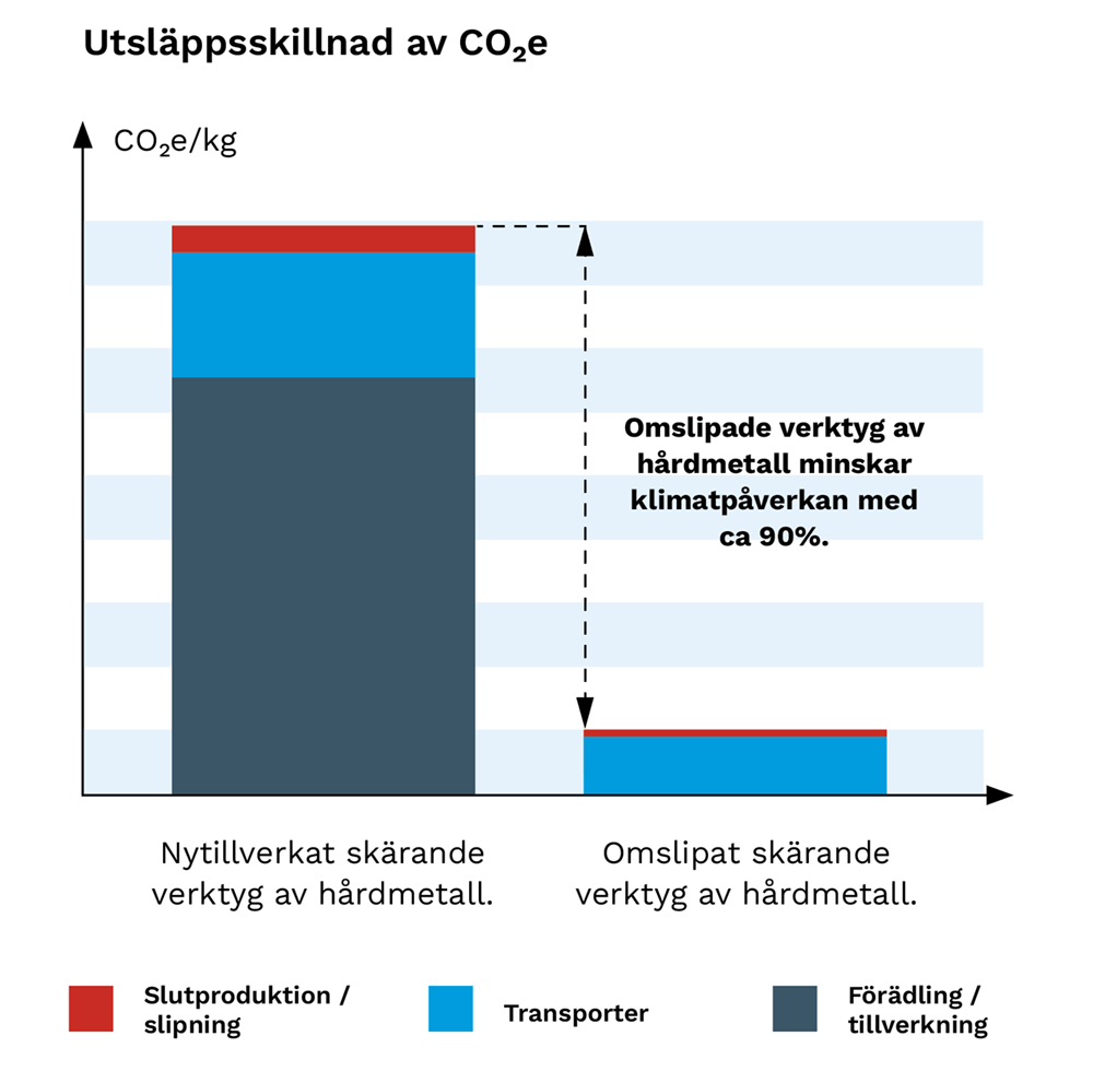 Ett nytt verktyg ger cirka fyra gånger högre utsläpp än ett omslipat verktyg. Ett verktyg kan som regel slipas om flera gånger och därmed sänks klimatpåverkan markant.